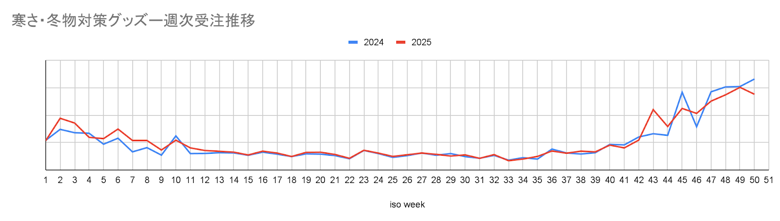 ●冬物グッズ:10月下旬の急な冷え込みと同時に、10/20週からマフラーやカイロ等の受注が急増しました(図3-1)。