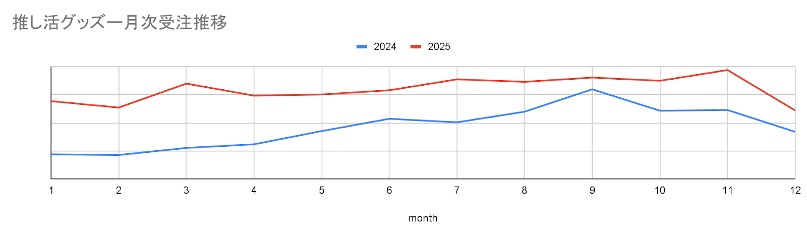 ◯推し活関連商品の受注は特定の月に集中するのではなく、通年でベース水準が上昇しており、推し活消費が生活の一部として定着している様子がECデータ上でも確認されました。